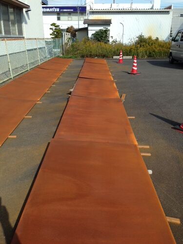 現場にて細部確認をしてから、建設会社さんに保管しているコールテン鋼のサビ具合を確認してきました。良い感じでサビており、モルタルとの相性は良さそうな感じです。 川本あ。